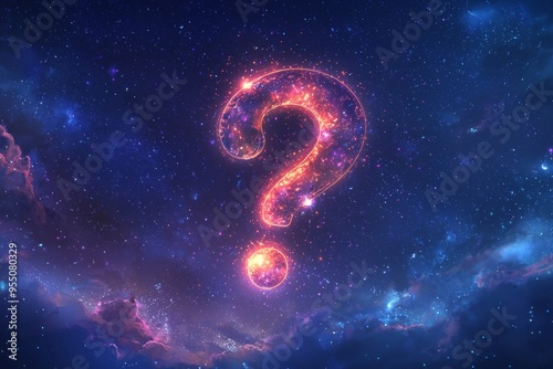 A question mark icon formed by glowing particles of light, floating in a starry night sky with a soft blue and purple gradient.
