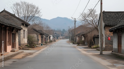 A quiet, empty street in a Chinese rural town, with traditional houses and no people around.