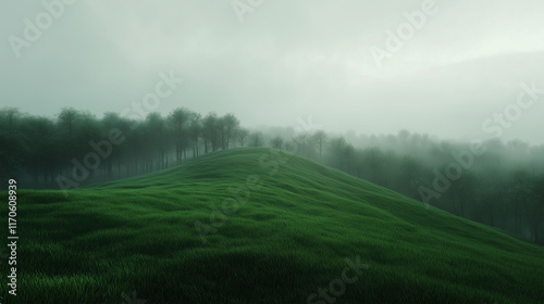 A quiet green hillside merging seamlessly into a foggy forest, where the mist blurs the lines