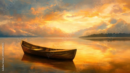 A quiet, reflective lakeside at dawn, where a single wooden boat drifts on the water, embodying solitude and the flow of time