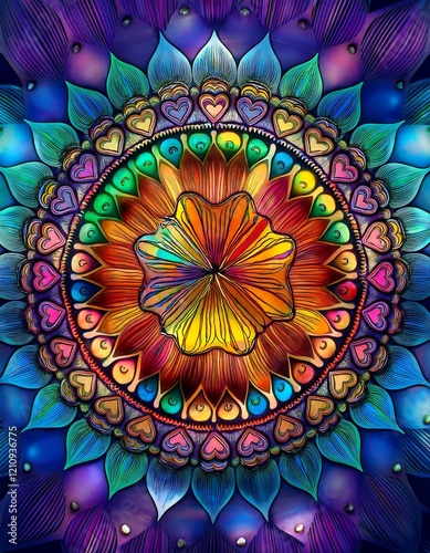 A radial mandala-like pattern made of diverse symbols representing inclusion (hearts, infinity signs, stars). The vibrant colors blend harmoniously, creating a sense of peace and unity.
