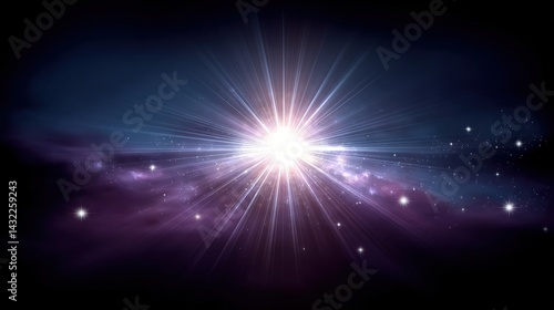A radiant burst of light emerges from a cosmic backdrop, filled with stars and nebulae, creating a stunning celestial scene.