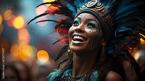 A radiant carnival queen with a feathered headdress and joyous expression amidst a festive backdrop.