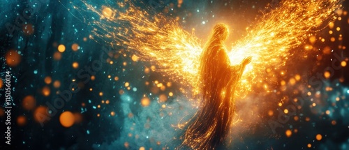 angel, light, energy, aethereal, particle, calmness, wonder, spiritual, fantasy, illumination, landscape, silhouette, vibrant, colours, magic, apparition, divine, scene, creation, serenity, beauty, atmosphere, artwork, dreamlike, glow, nature, celestial, shimmering, wing, inspiration, emotion, vision, design, halo, spirituality, surreal, movement, color palette, warm, cool, harmony, ambience, reality, enchantment