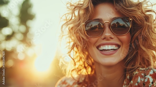 A radiant woman with curly hair and sunglasses smiles sincerely, bathed in warm sunshine, embodying positivity and joy in a natural, glowing outdoor setting.