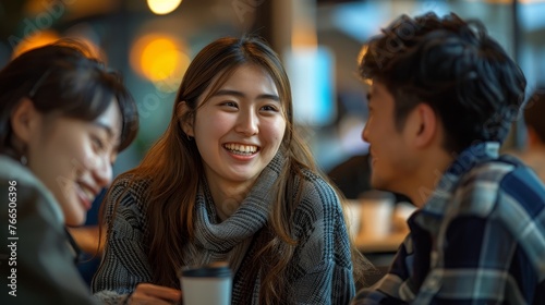 A radiant young woman smiles while enjoying a warm conversation with friends over coffee in a cozy cafe setting.
