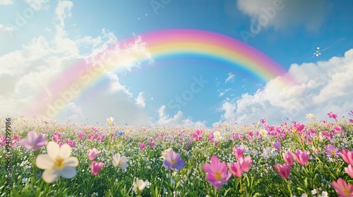 A rainbow stretching across a blooming meadow, with plenty of room for copy in the sky