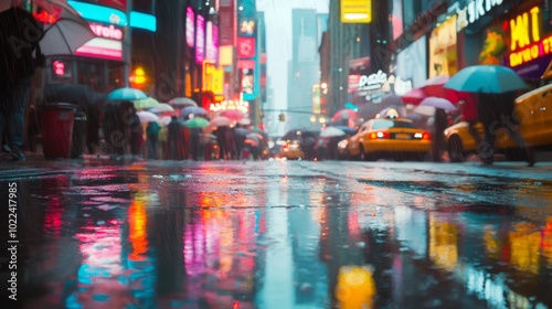 rain, night, city, street, light, neon, wet, sidewalk, asphalt, urban, blur, blurry, bokeh, city landscape, building, traffic, yellow, red, blue, green, people, umbrella, car, taxi, tied-up, abstract, colourful, atmosphere, mood, dark, gloomy, vibrant, dynamic, motion, movement, energy