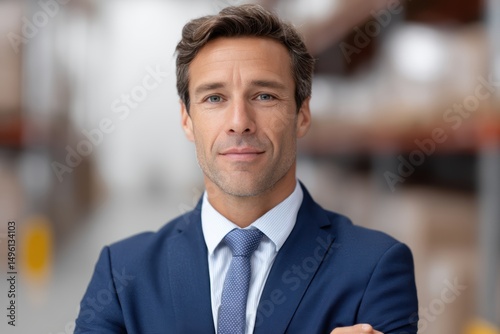 A real estate agent in logistics warehouse, professional look professional photo on white background