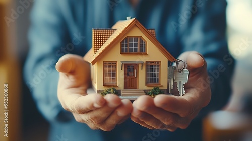 A real estate salesperson holds a small house model to introduce customers Model house project and give keys to customers New home buyers get approved for a home loan and insurance con : Generative AI