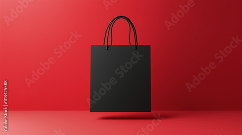 A realistic and visually striking high-quality black paper shopping bag set against an elegant backdrop.