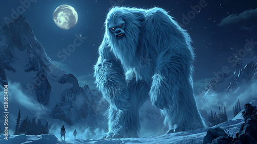A realistic animation of a towering yeti standing in a snowy mountain landscape, its fur glistening under the moonlight as it observes distant travelers from the shadows