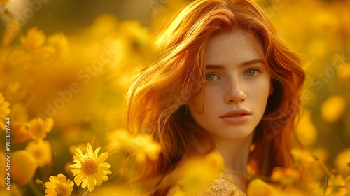 A realistic close up of a stunning young red haired woman standing in front of a sea of yellow flowers. The warm, golden light highlights her radiant hair and soft features. The