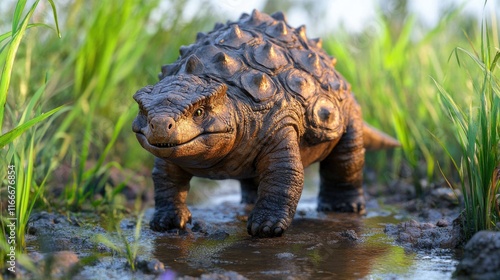 turtle, creature, prehistoric, nature, grass, water, environment, wildlife, reptile, landscape, realism, texture, detail, animal, habitat, ecology, shell, muddy, terrain, amphibian, fauna, scene, sculpture, design, model, art, fantasy, imagination, biology, evolution, species, conservation, flora, ecosystem, ancient, geology, biodiversity, aesthetic, visual, illustration, creative, animal kingdom, earth