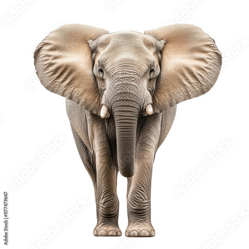 a realistic depiction of an elephant standing upright. showcasing its large ears. trunk. and tusks against a plain white background the majestic features of the elephant. highlighting its size and uni
