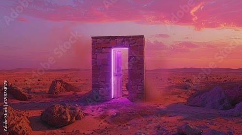 realistic, photograph, rustic, stone, door, standing, alone, in, huge, desert, ajar, bright, turquoise, light, streaming, out, creating, surreal, contrast, the, sandy, landscape