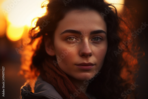 A realistic human-portrait of a young woman, her face illuminated by the setting sun.