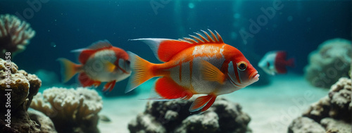 fish, red, white, tank, aquarium, coral, rock, bottom, swim, artificial, water, blue, fin, tail, orange, stripes, scale, underwater, aquatic, life, nature, animal, marin, tropical, pet, hobby, home, decor, decoration, salt water, fresh water, goldfish, betta, guppy, tetra