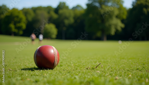 A red cricket ball resting on the lush green grass under a bright blue sky in a tranquil park setting on a sunny afternoon