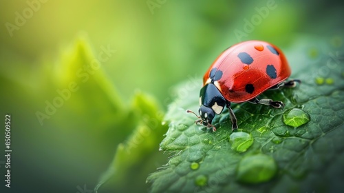 A red ladybug with black spots and tiny water droplets on a green leaf, showcasing detailed texture and freshness