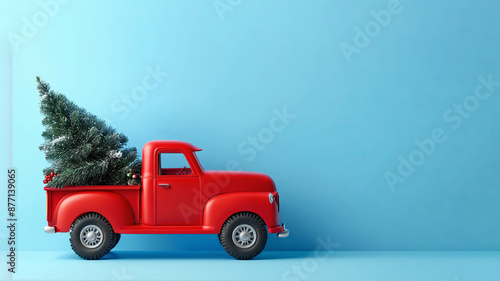A red pickup truck with a Christmas tree on a flat light blue background with a place for text. The concept of celebrating Christmas and New Year.