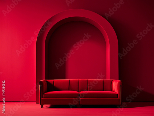 A red sofa in a red room with arched architectural details
