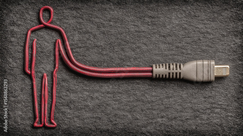 A red wire shaped like a human figure connects to a gray USB plug on a textured dark surface, symbolizing human-technology connection.