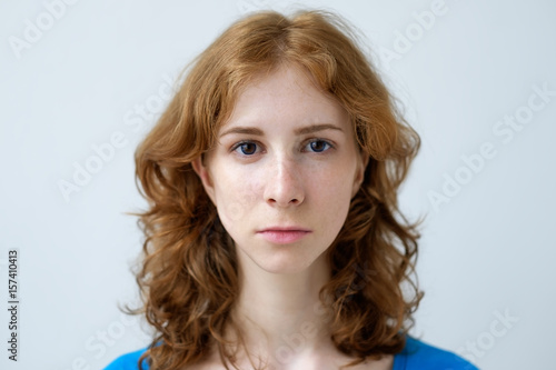 A red-haired girl with freckles looks ahead. Expression of a person without emotions.