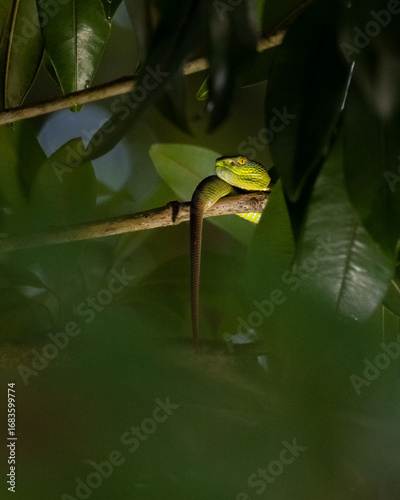 A red-tailed bamboo pit viper coils silently amid the dense foliage of Sundarbans National Park, West Bengal, its vibrant scales blending seamlessly with the emerald thicket.