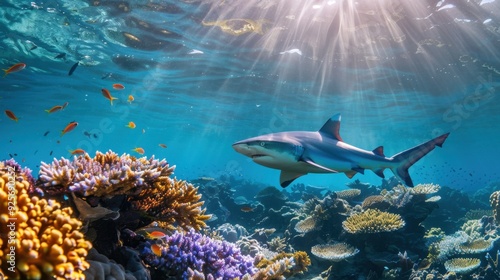 A reef shark swimming near a coral reef, representing the balance of predator and prey in marine environments.
