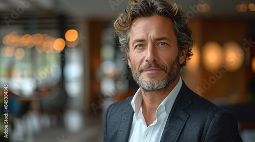 A refined businessman in a suit poses with confidence in a well-lit, modern restaurant setting