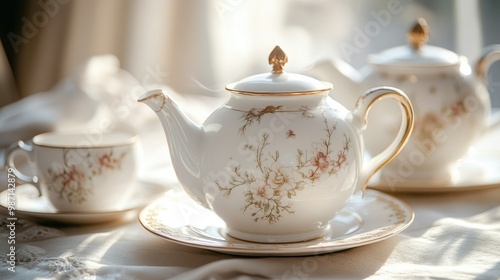 A refined white teapot and creamer set with gold trim and floral patterns, arranged on a soft, neutral-colored tablecloth.