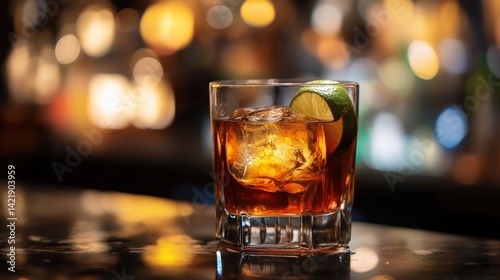 drink, cocktail, glasses, bar, ice, liqueur, alcohol, beverage, lime, citrous, refreshment, liquid, cube, cold, dark, amber, brown, clear, transparent, garnish, slice, wedge, background, blurred, light, bokeh, surface, table, wet, glossy, edge, square, shape, texture, elegant, sophisticated, luxury, appetising, delicious, close, up, sharpened, detail, lifestyle, celebration, nightlife, gathering