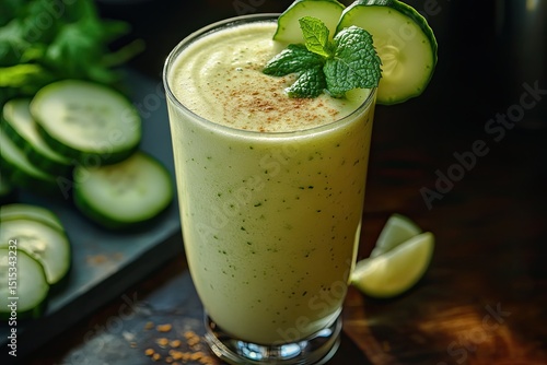 A refreshing cucumber and lime smoothie, garnished with cucumber slices and mint leaves