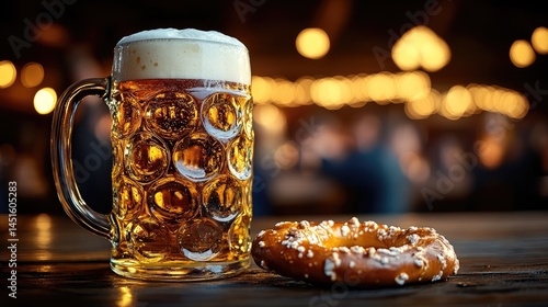 A refreshing glass of beer beside a delicious pretzel on a wooden table in a cozy bar atmosphere with warm lighting