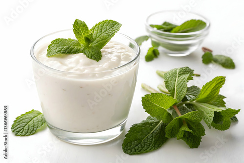 A refreshing glass of creamy, frothy yogurt drink garnished with fresh mint leaves, set against a clean white background,Green smoothie garnished with fresh mint leaves,glass of yogurt with mint.