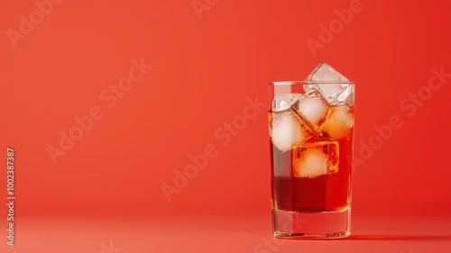 A refreshing glass of iced drink with visible ice cubes against a vibrant red background, perfect for summer or relaxing moments.