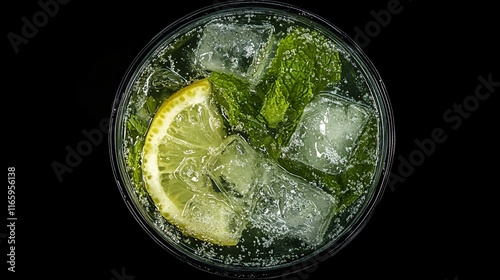 A refreshing mint and lemon cocktail with ice, captured from above on a black background.
