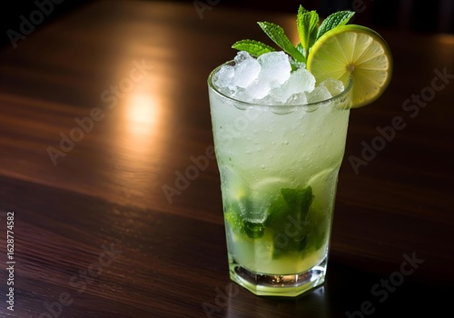 A refreshing mojito in a tall glass, filled with crushed ice, mint leaves, and a slice of lime, set on a wooden table.