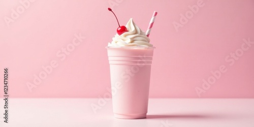 A refreshing pink milkshake, topped with whipped cream and a cherry, sits on a pale surface against a soft pink backdrop.