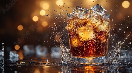 A refreshing soda splash with ice cubes and condensation on the glass against a transparent background, creating a dynamic and thirst-quenching image