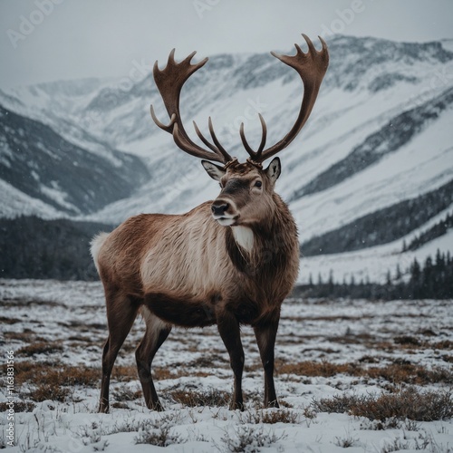 A reindeer with majestic antlers standing amidst a snowy wilderness.