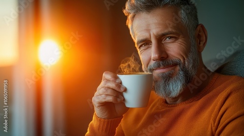 A relaxed and content man in a cozy sweater savors a steaming cup of coffee while enjoying the serene beauty of a warm morning sunrise, depicting tranquility and peace.