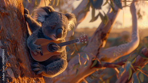 A relaxed koala sitting in a tree, strumming a small guitar with a look of contentment, set against the backdrop