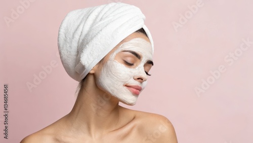 A Relaxing Spa Treatment: Woman with Face Mask and Towel Against Soft Pink Background