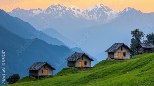 mountain, village, remote, peaceful, scenic, landscape, hut, cabin, rural, natural, serene, tranquil, hillside, grass, tree, green, peak, sunset, dusk, cosy, home, isolated, wilderness, adventure, escape, solitude, rustic, traditional, culture, lifestyle, agriculture, environment, climate, geography, outdoors, travel, tour tourism, photogenic, idylli