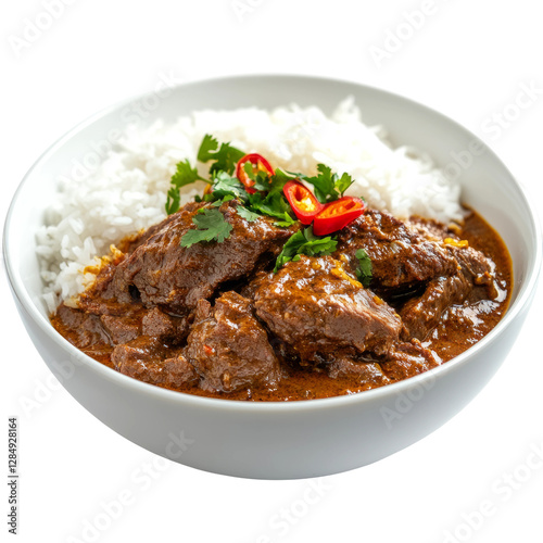 a rendang beef with rice on a white bowl white background
