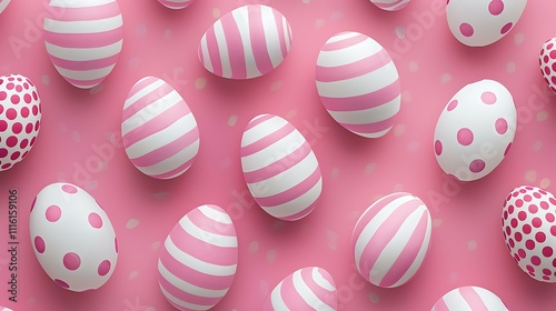 A repeating design of pink and white Easter eggs decorated with polka dots and stripes, evenly spaced on a warm pink background