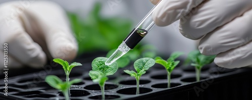 A researcher in gloves uses a pipette to transfer liquid to young green plants in a lab setting, focusing on growth and experimentation.