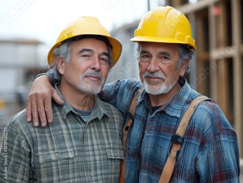 A respectful, touching portrait of two mature construction workers wearing yellow helmets and plaid shirts, showing camaraderie and friendship at a building site